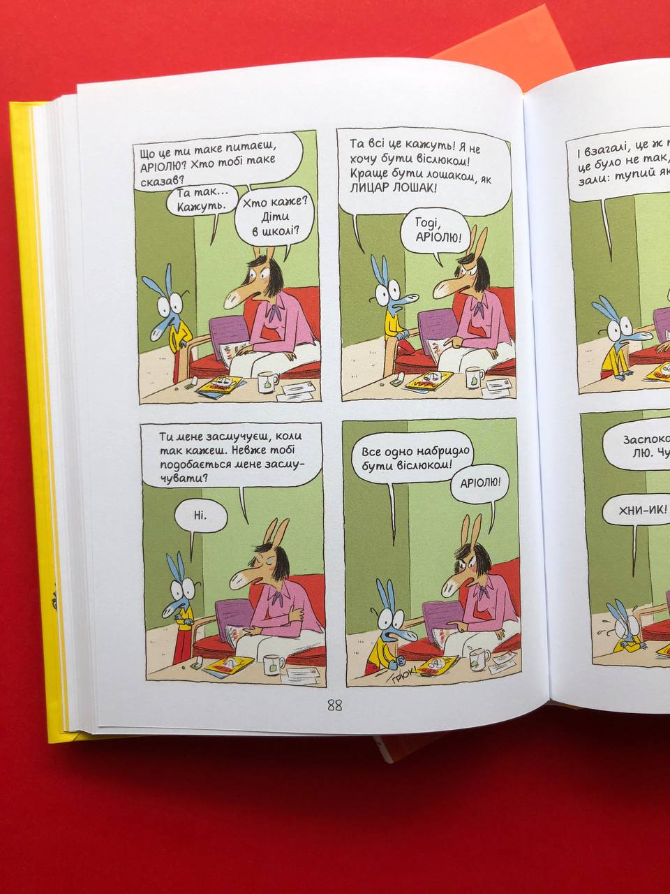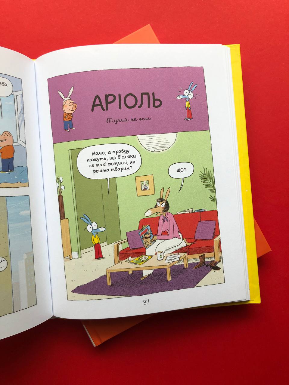 Аріоль — звичайний маленький ослик в окулярах. Він мешкає у передмісті з мамою й татом. Його найкращий друг — порося Рамоно. А ще він закоханий у свою однокласницю-теличку. Його класний керівник — великий пес, а фізкультурник — кремезний півень. Словом, Аріоль в усьому схожий на нас із тобою.