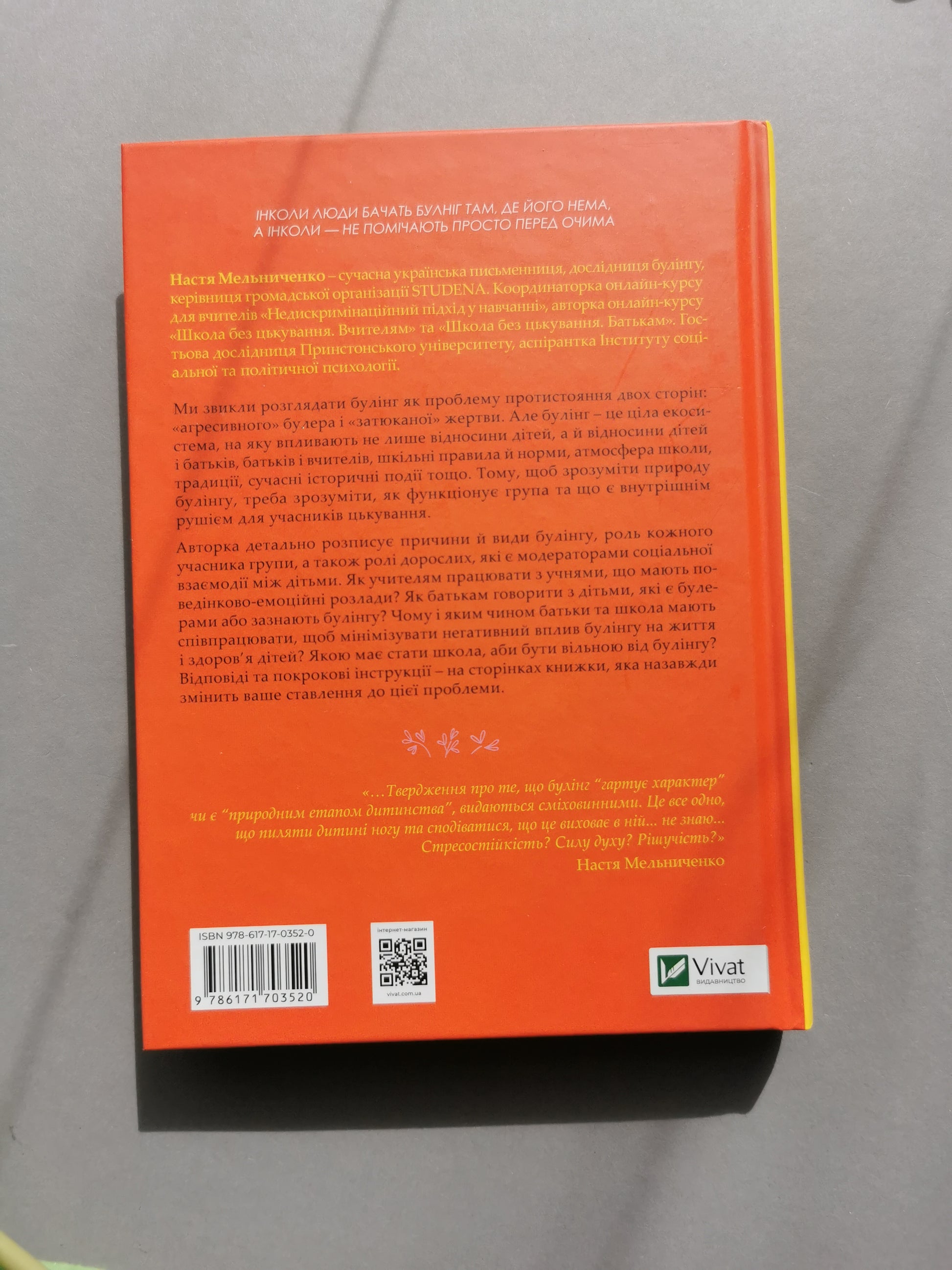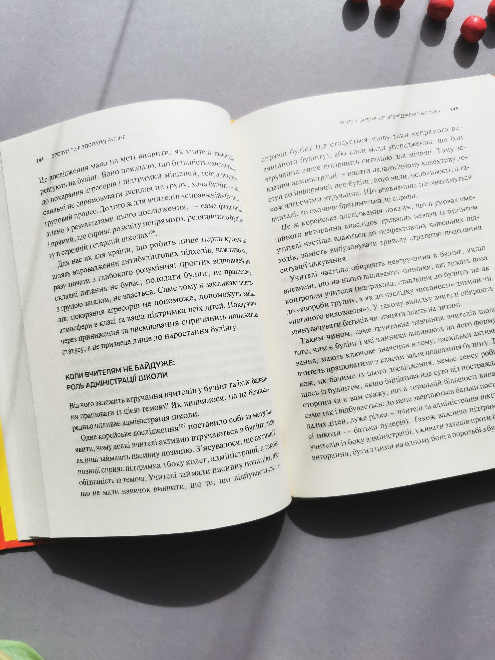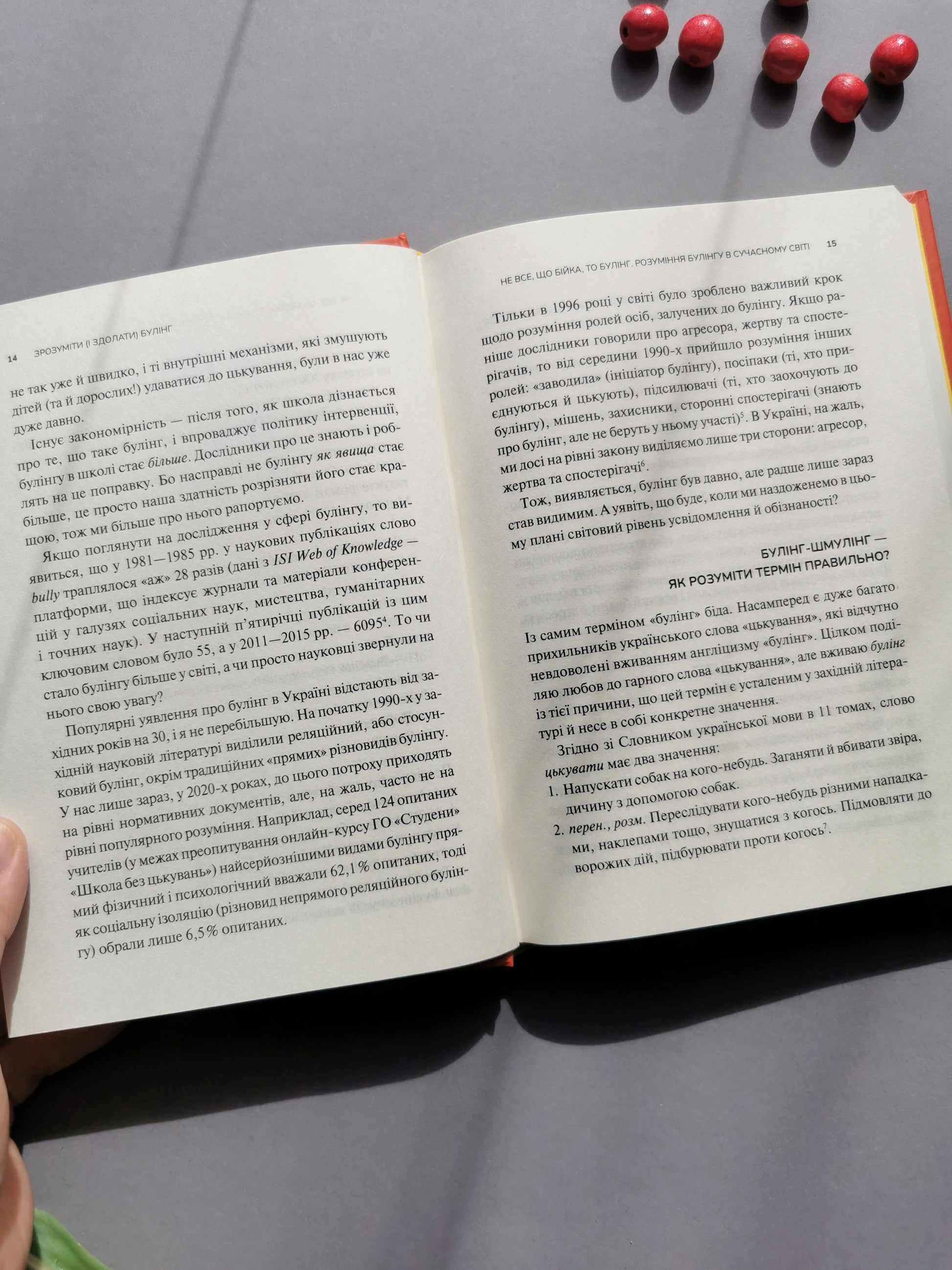 Авторка детально розписує причини й види булінгу, роль кожного учасника групи, а також ролі дорослих, які є модераторами соціальної взаємодії між дітьми. Як учителям працювати з учнями, що мають поведінково-емоційні розлади? Як батькам говорити з дітьми, які є булерами або зазнають булінгу? Чому і яким чином батьки та школа мають співпрацювати, щоб мінімізувати негативний вплив булінгу на життя і здоров’я дітей? Якою має стати школа, аби бути вільною від булінгу?