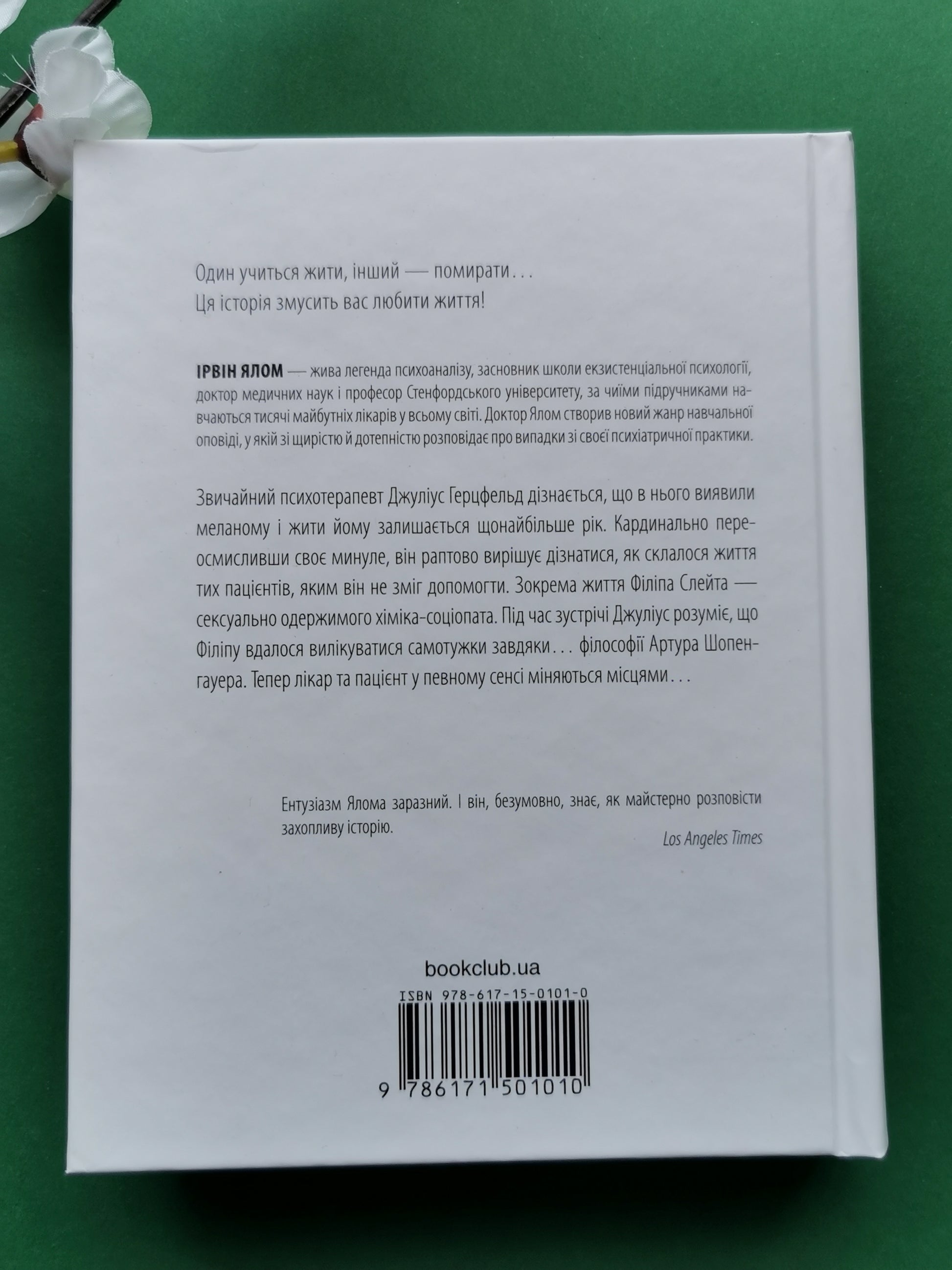 Звичайний психотерапевт Джуліус Герцфельд дізнається, що в нього виявили меланому і жити йому залишається щонайбільше рік. Кардинально переосмисливши своє минуле, він раптово вирішує дізнатися, як склалося життя тих пацієнтів, яким він не зміг допомогти. Зокрема життя Філіпа Слейта — сексуально одержимого хіміка-соціопата. Під час зустрічі Джуліус розуміє, що Філіпу вдалося вилікуватися самотужки завдяки… філософії Артура Шопенгауера. Тепер лікар та пацієнт у певному сенсі міняються місцями…
