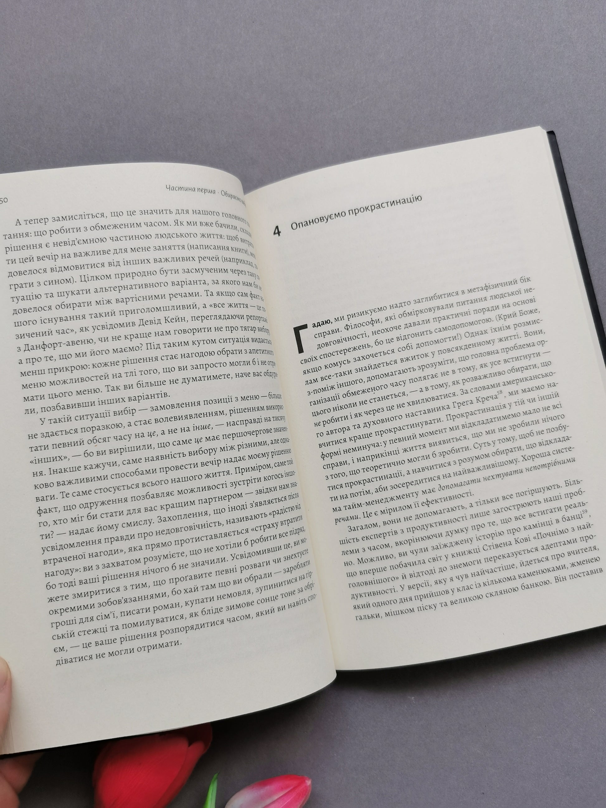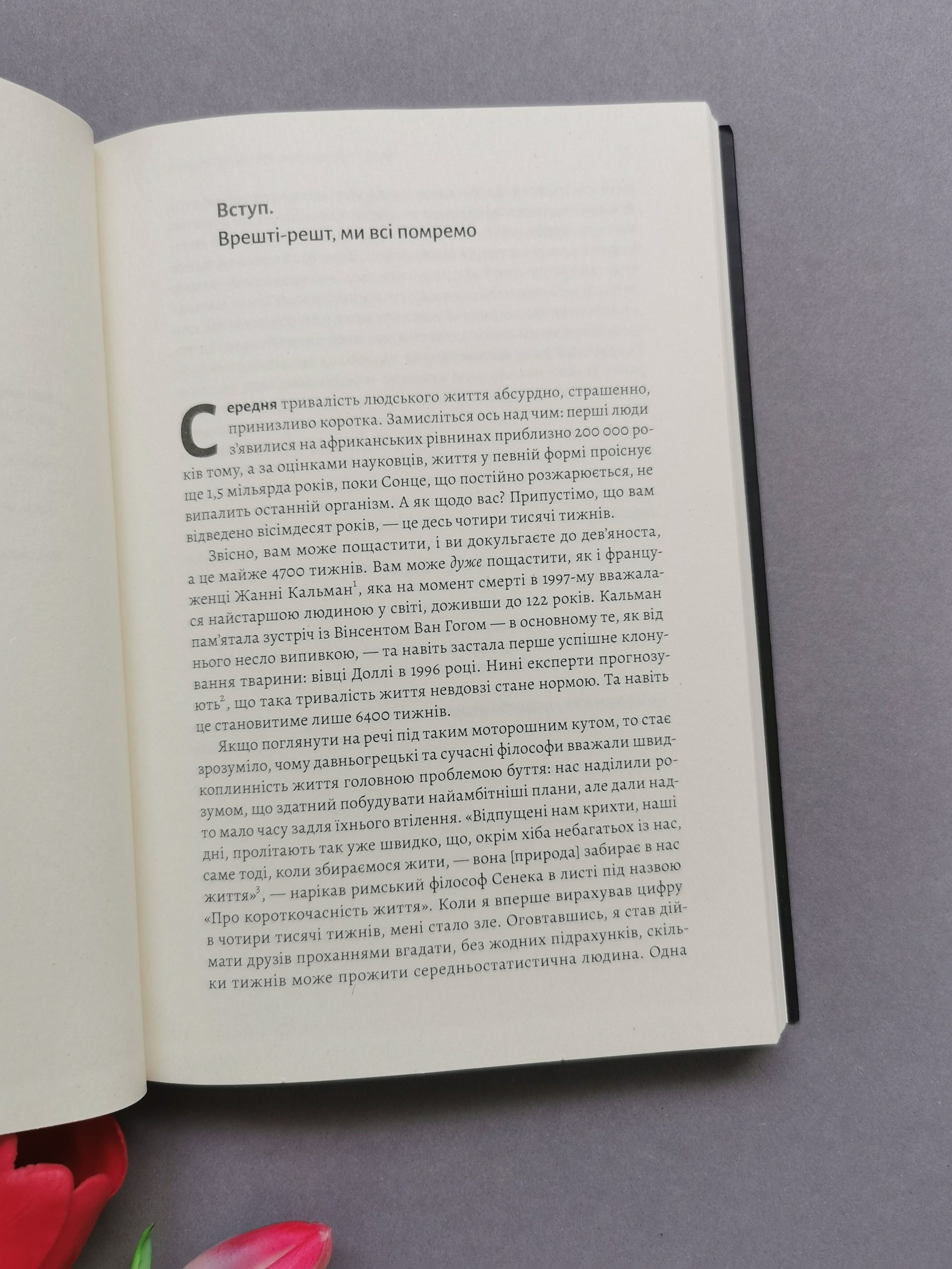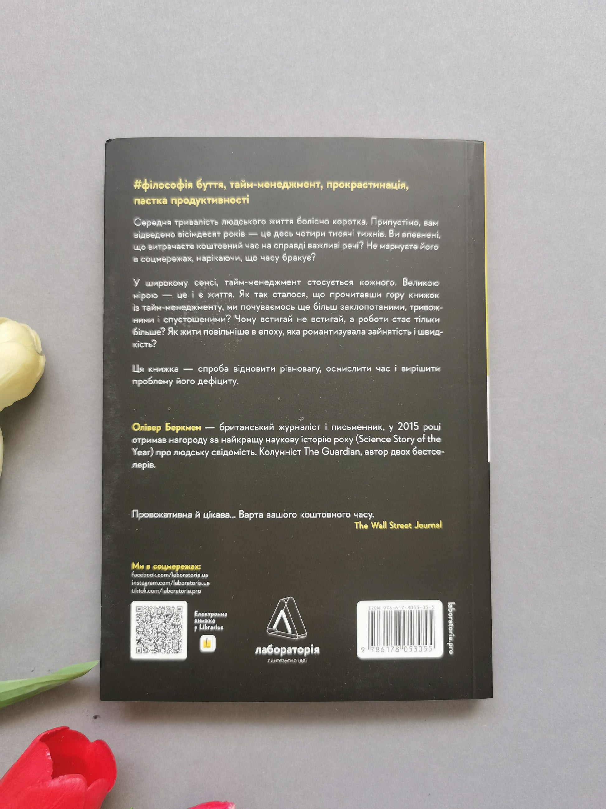 Людське життя сміхотворно коротке. Все, що ми маємо — це в середньому 4 тисячі тижнів, або ж 80 років. Усвідомивши це, вам точно перехочеться витрачати свій час на скроління соцмереж. В погоні за продуктивністю та намаганням все встигати, ми часто втрачаємо зв’язок із самими собою, забуваємо, що для нас справді важливо. Пріоритетність розмивається, а бажання завжди досягати максимальних результатів робить нас надміру тривожними, викликає стрес і роздратування. Як зрозуміти, що для нас є справді важливим, а що не варте і крихти нашого часу? Як наповнити своє життя сенсом та зосередитись на справді важливих для нас речах? Так, чотири тисячі тижнів — це справді мало. Але цього точно достатньо, щоб прожити усвідомлене та наповнене життя. Автор поєднує підходи стародавніх та сучасних філософів, психологів та духовних вчителів, щоб вибудувати свою теорію про управління часом. Саме тому знання, які він виклав у цій книжці, не старіють і не втрачають свою актуальність і до сьогодні, бо базуються на вічних цінностях.