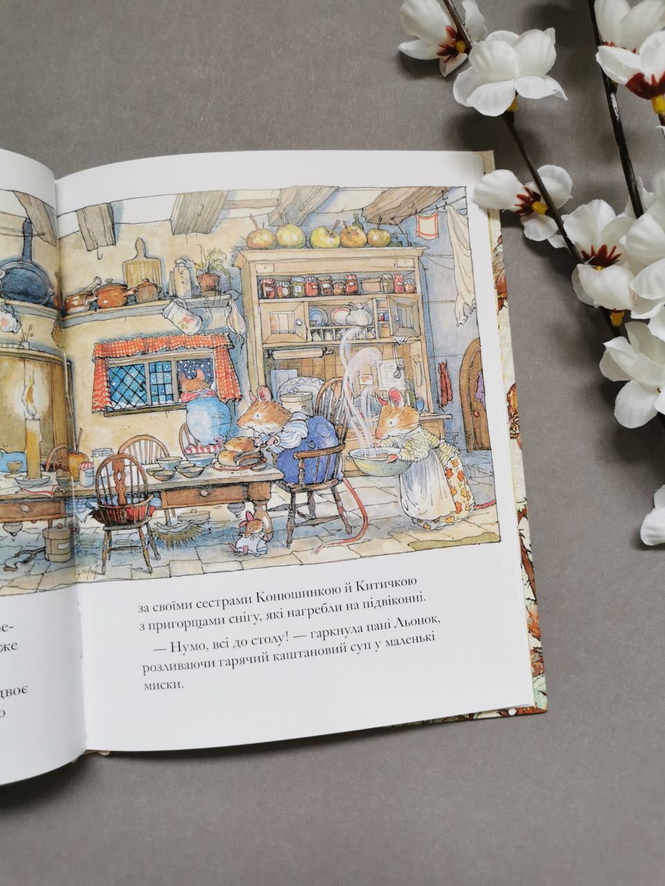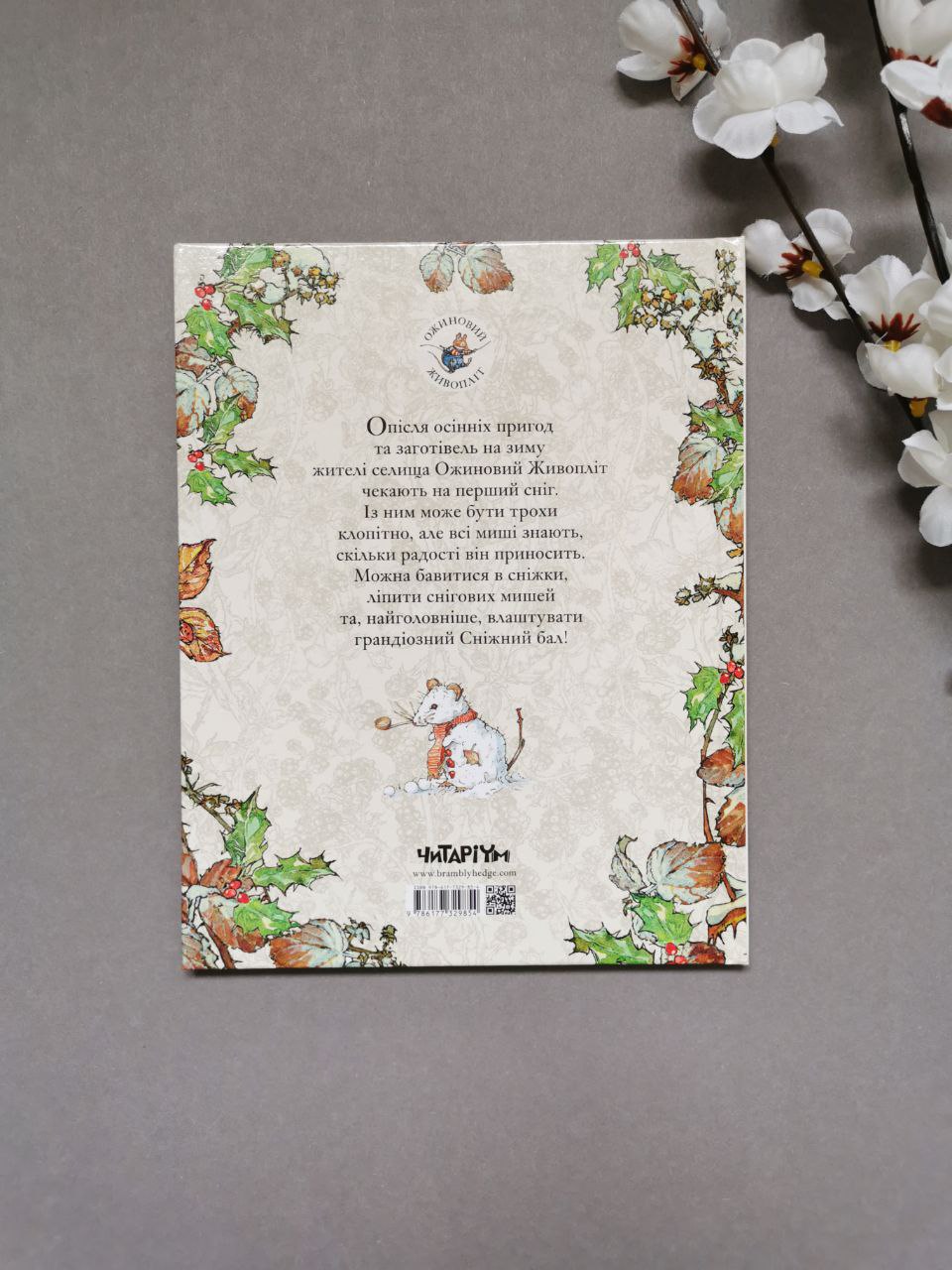 Загляньмо за Ожиновий живопліт, притрушений пухнастим і хрумким снігом. Тут на іншій стороні струмка, за полем, серед коренів і в старих стовбурах дерев живуть милі мишки, з якими відбуваються різні історії. Зимою все навкруги застелив м’який сніг, подарувавши маленьким сердечкам відчуття свята. Саме тому мишки вирішують влаштувати сніговий бал, і для цього вони будують під заметом Крижаний зал. Що ж вийде з цієї затії? Дізнавайтеся з книги. Казкову, ніжну та зворушливу атмосферу у «Зимовій історії» доповнюють ніжні ілюстрації, які наповнені щирими емоціями!