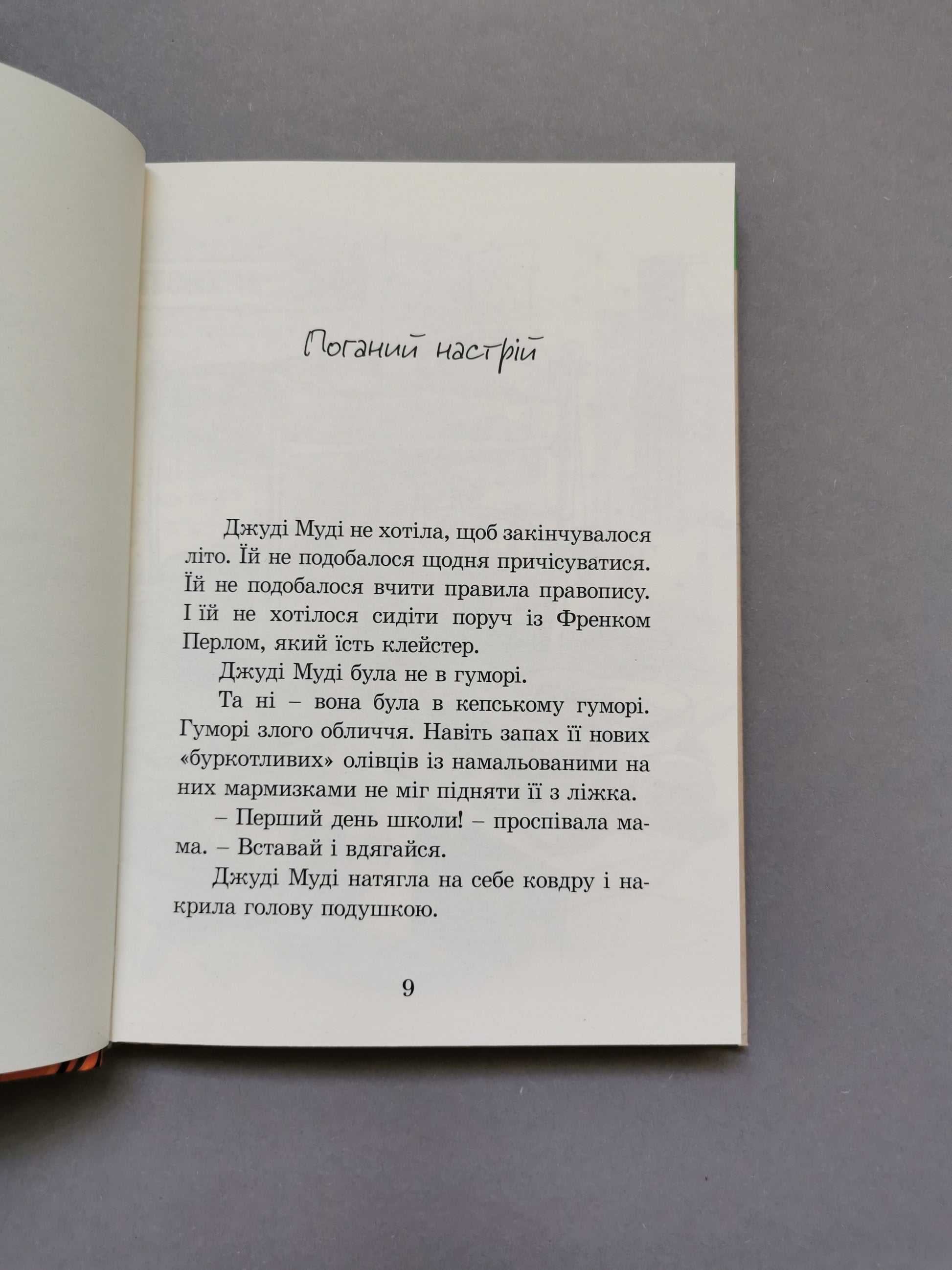 У першій книжці з серії про Джуді Муді на вас чекає знайомство з цією кумедною дівчинкою, у якої частенько змінюється настрій. Він буває хороший, поганий, передшкільний, шкільний – який завгодно. А ще у неї є молодший братик Стінк, найкращий друг Рокі та «заклятий» друг Френк Перл. Вони потрапляють у різноманітні пригоди, вчаться тішитися маленьким і великим радощам. А головне – вони неодмінно подарують усім читачам усмішку!