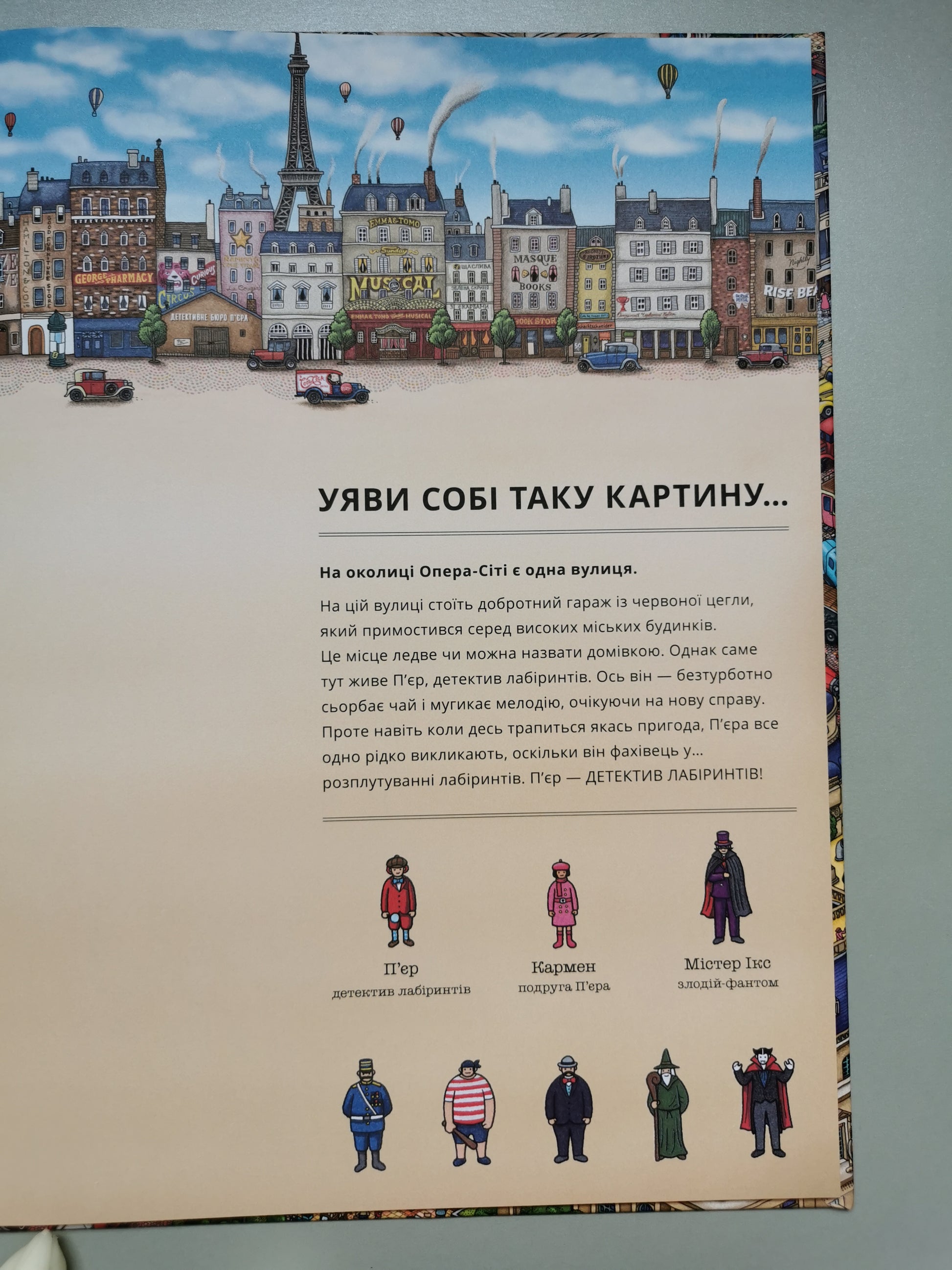 П’єр, детектив лабіринтів, отримав нову справу. Містер Ікс викрав Камінь Лабіринту, який має силу перетворювати все в Опера-Сіті на лабіринти. Допоможи П’єру та його подрузі Кармен віднайти шлях у лабіринтах і зупинити Містера Ікс, доки не пізно. У цій прекрасно ілюстрованій книзі-квесті тобі потрібно знайти шлях у кожному фантастичному лабіринті, розпізнати ключі, що ведуть до розгадки, та вирішити спеціальні завдання, щоби стати героєм дня!