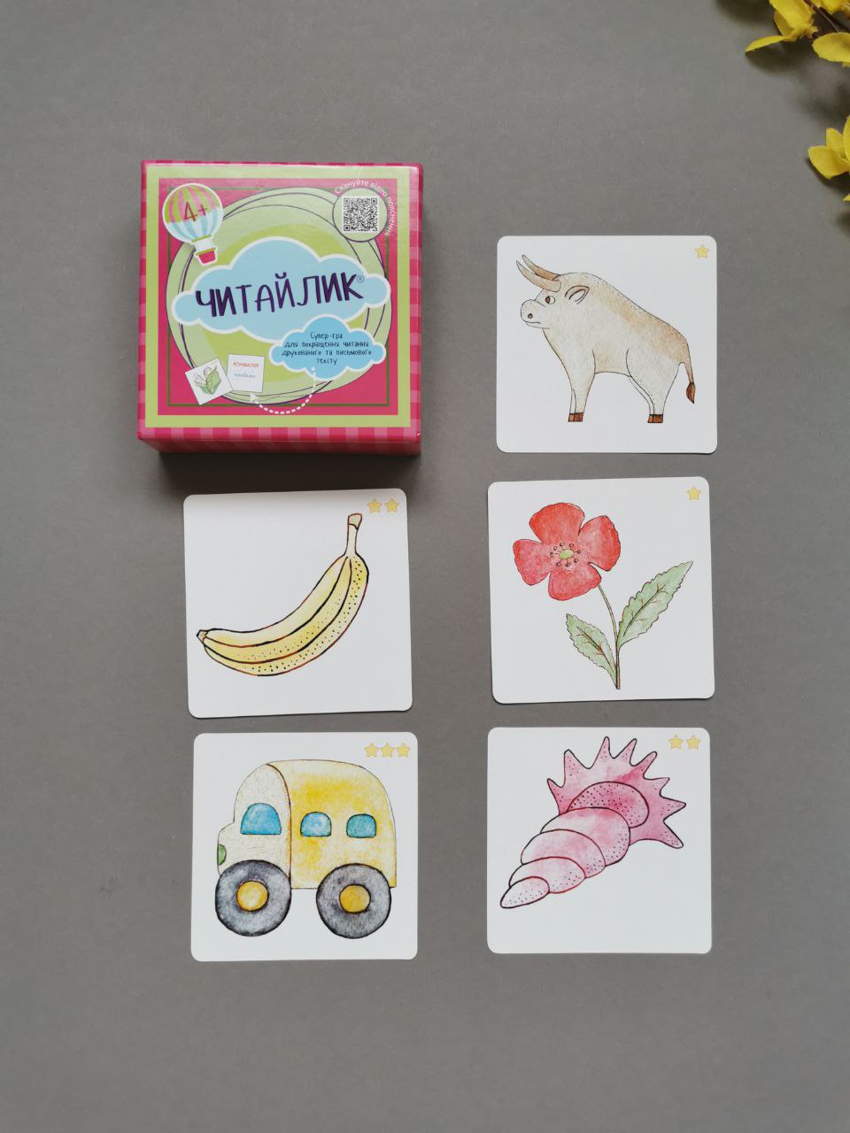 для покращення навичок читання друкованого та письмового тексту Вміст: 70 двосторонніх карток (малюнок + підпис друкованим та письмовим шрифтом)