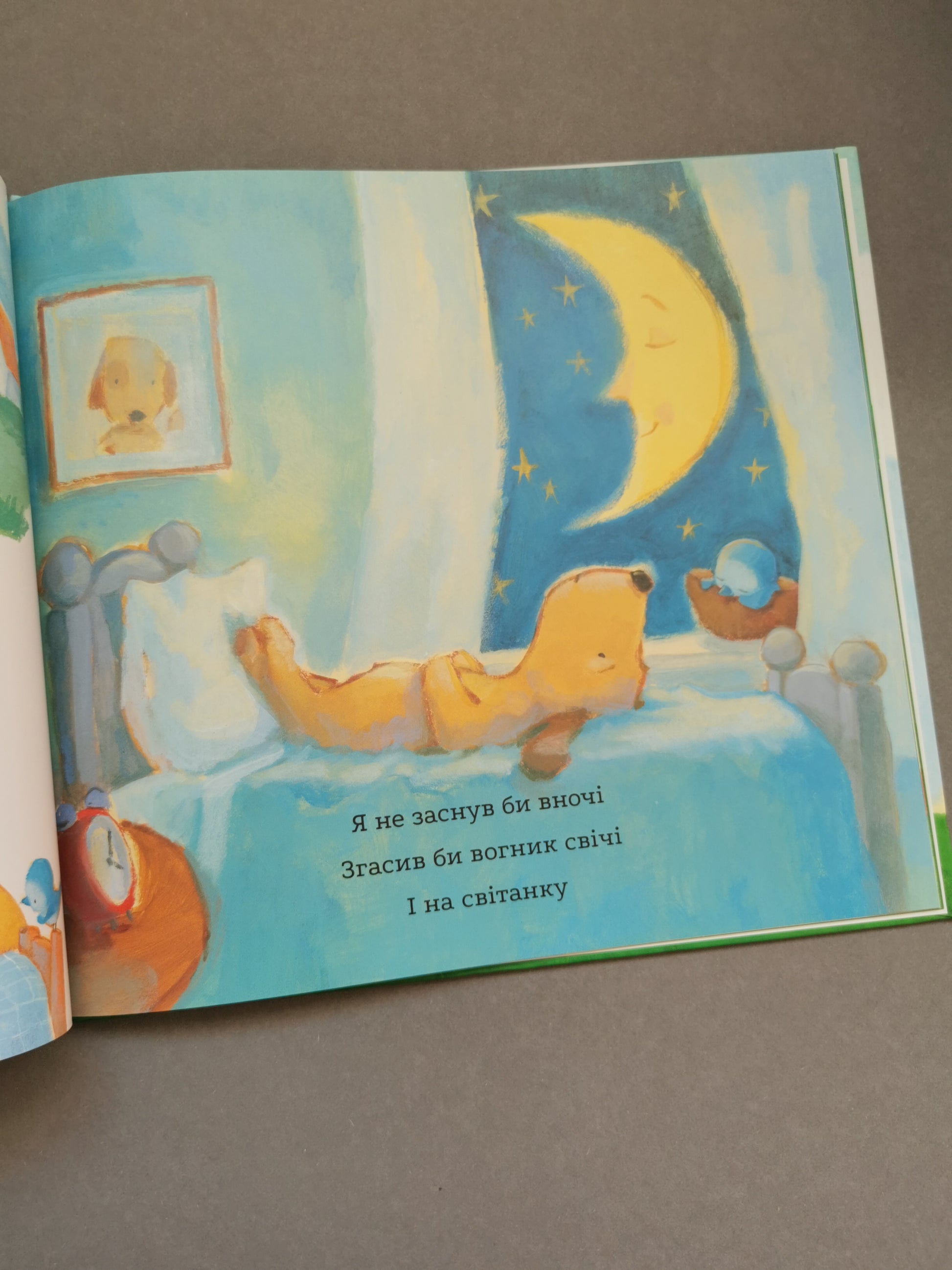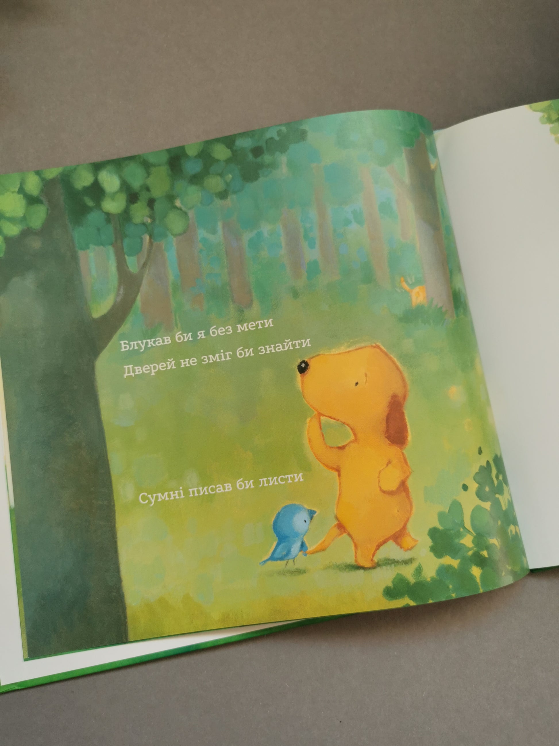 Кому не знайоме те відчуття, коли в центрі твоєї світобудови – рідна людина, котра відповідає на всі твої запитання, терпляче пояснює і щиро любить? До того ж, приклад ідеальних стосунків двох поколінь однієї сім’ї ілюстратор Дейвід Вокер вирішив передати через образи двох милих песиків, яких і сам обожнює. Загалом зображенням, що займають весь простір сторінок, притаманна ніжність та «плюшевість» через пастельні тони і м’якість контурів. У такому форматі повсякдення постає казковим та захопливим. Затишну та справді музичну атмосферу вдалося створити завдяки задушевній ліриці Боба Дилана, що зазвучала українською в перекладі Віктора Морозова, композитора та поета. Він зберіг специфічні ритмічні та мовні особливості оригінального тексту. Її можна (треба) не лише прочитати, але й заспівати.