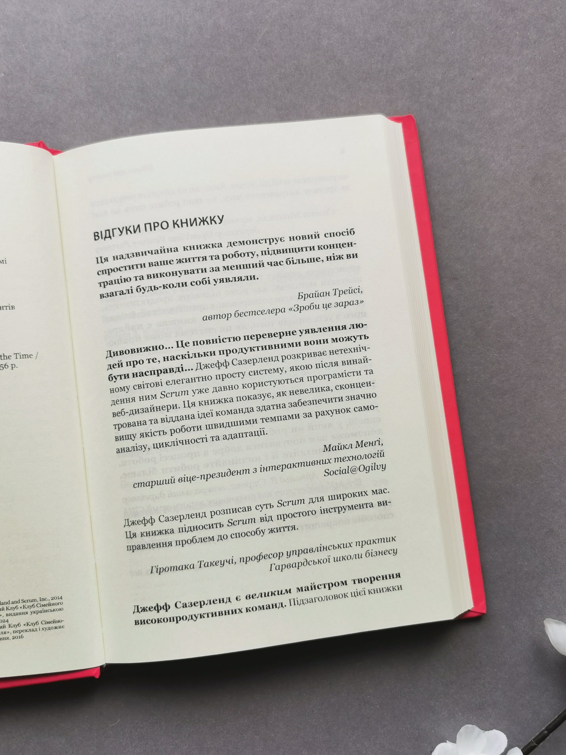 У надшвидкому та гіперконкурентному світі ХХІ століття немає місця для марнування — часу, зусиль, ресурсів. Та навіть якщо ви зробите те, що планували, коли планували та вкладетеся в бюджет, може виявитися, що клієнт уже потребує чогось іншого. Адже умови змінюються з небаченою раніше швидкістю... Унікальна методика Scrum руйнує стереотипи старої методики управління проєктами. Її основа — команда, що має надзвичайне почуття мети, самоорганізовується та самоуправляється, а навички її учасників підсилюють одна одну навіть без зусиль з їхнього боку. І, якщо, зробивши крок у нову еру під назвою Scrum, ви не зробили вдвічі більше за половину часу, вам потрібно лише ще раз уважно перечитати цю книгу!